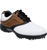 FootJoy Contour Mens Golf Shoes feature: White smooth leather body, tan nubuc saddle/black smooth underlay Sporty golf shoe design with full-grain waterproof leather uppers Slip last construction allows all components to be built to more closely match the shape of the foot, thereby increasing comfort and flexibility. Contoured lightweight Poly Urethane Fit-Bed Contoured poly urethane midsole insert Contoured ultra-cushioned EVA midsole Ultra flexible Duramax rubber outsoles, a proprietary compound to FootJoy, deliver excellent traction and durability TPU stability bridge is water impermeable, lightweight, and durable FTS Spike System Black Widow cleats by Softspikes Greens friendly traction and cushioned comfort One-quarter turn to insert, two clicks for a dead-lock Contour last Full rounded toe character, full across the forefoot, standard instep and heel Two-year limited waterproof warranty | ||||||||||||