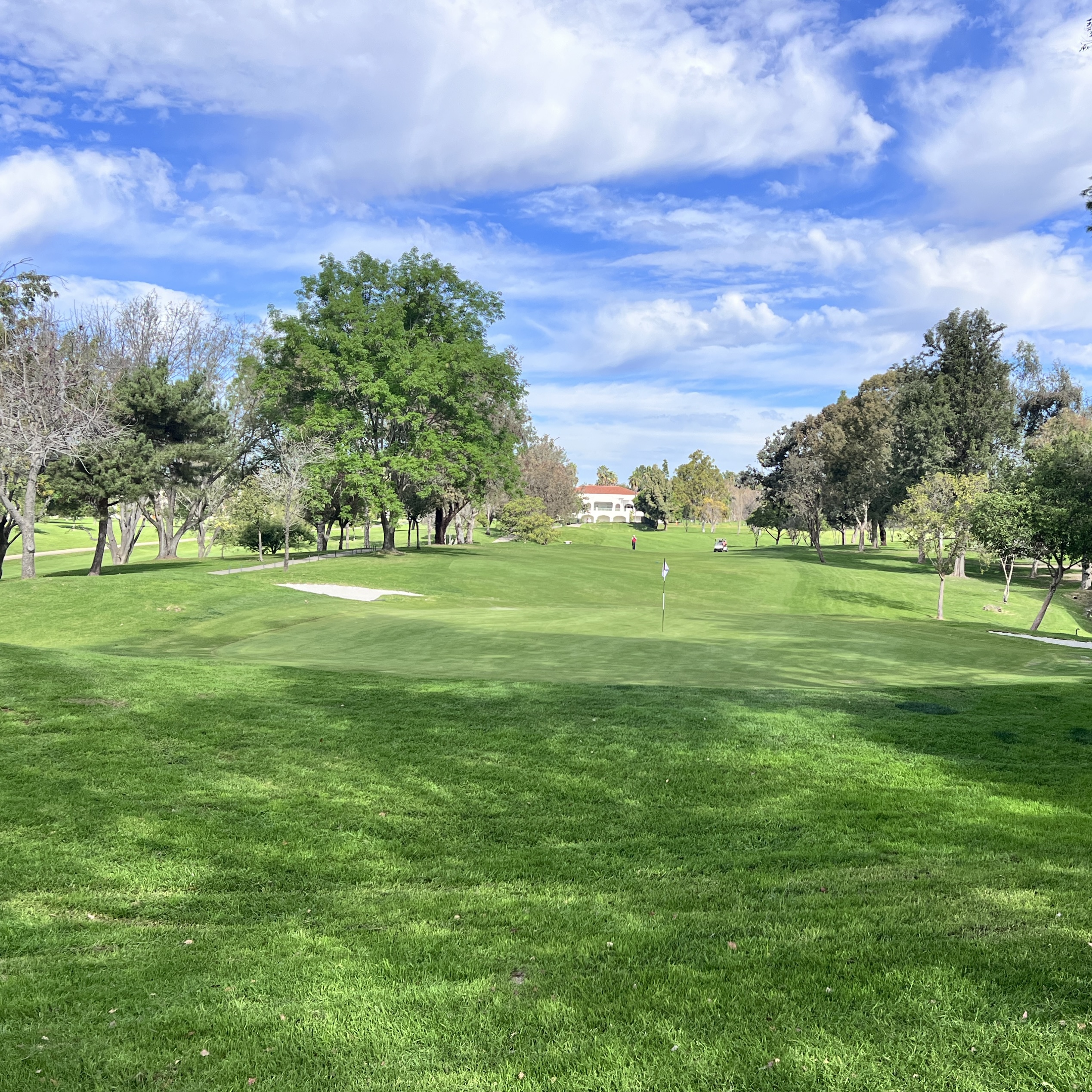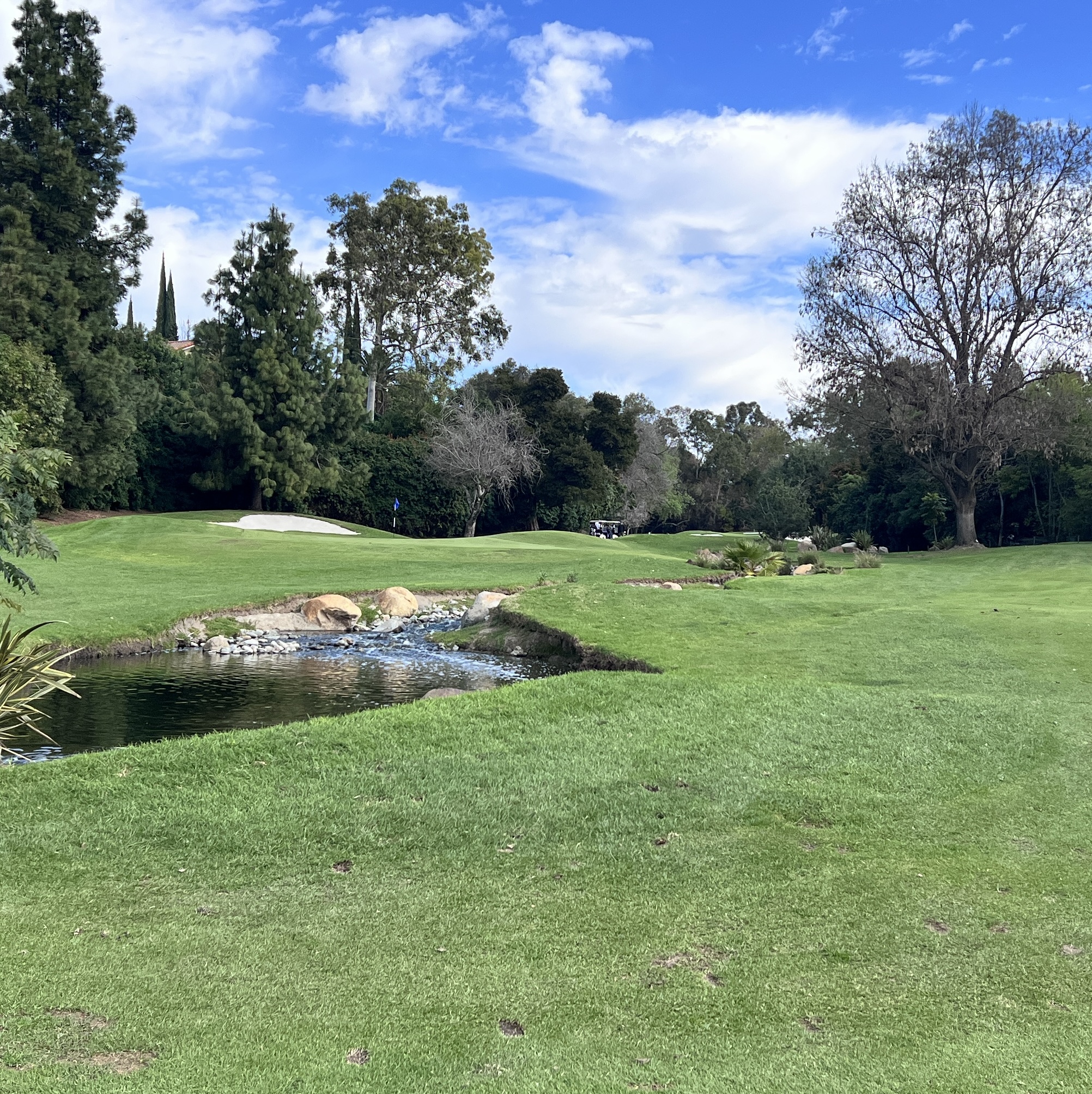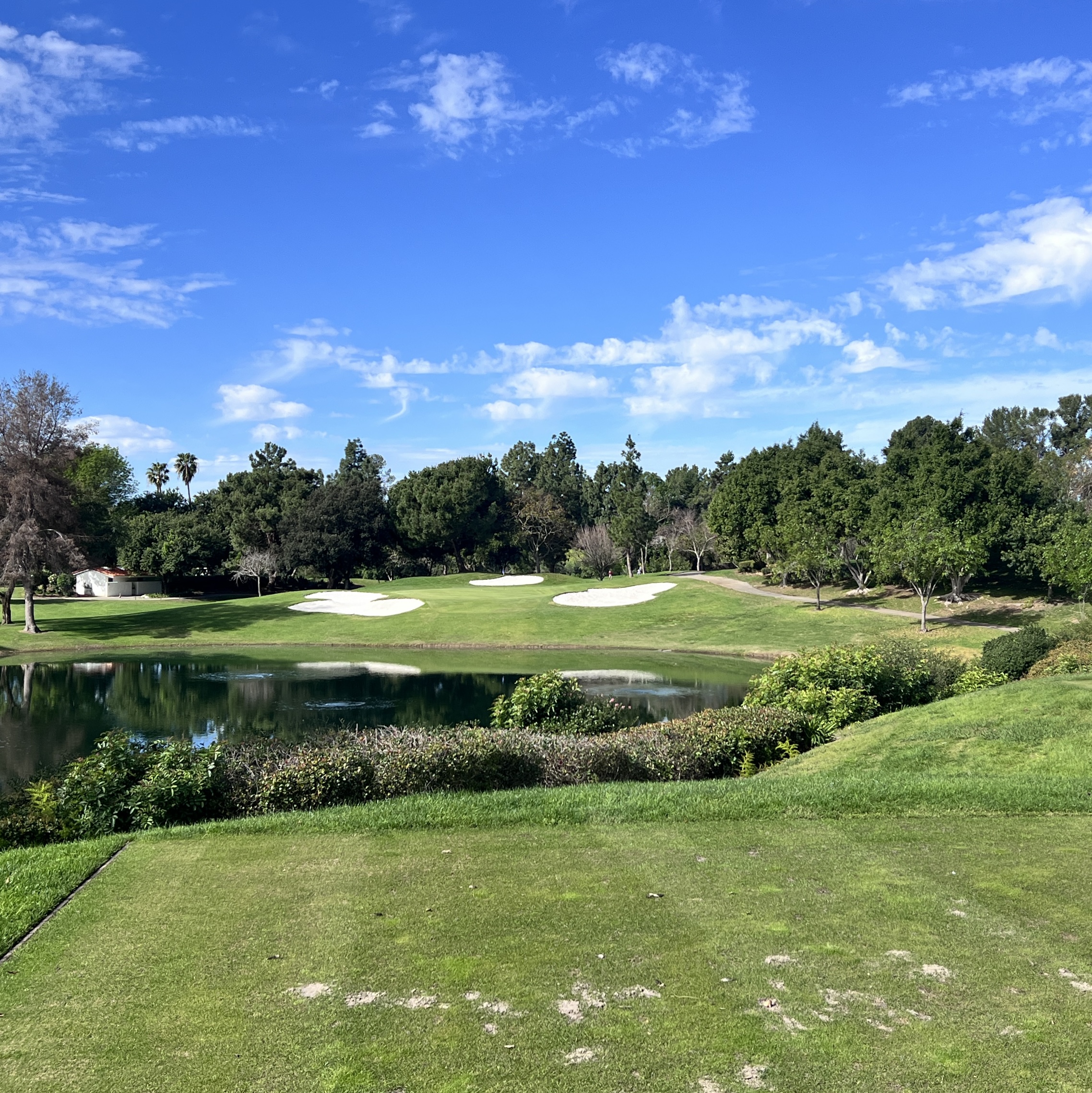 Downhill par 3. Hit at least one club less than normal, probably two clubs less. Green is deep, a difference of a club between the front and back.